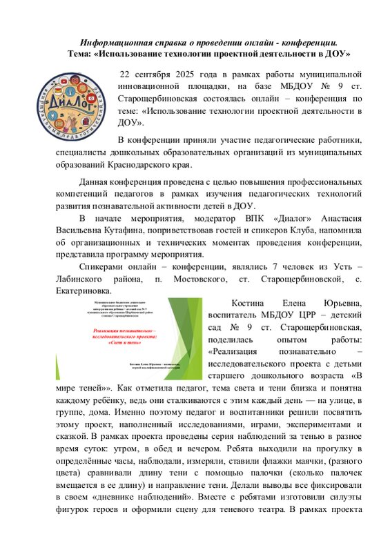 Информационная справка р проведении онлайн - конференции. "Сетевое сообщество педагогов". Тема: "Использование технологии проектной деятельности в ДОУ"