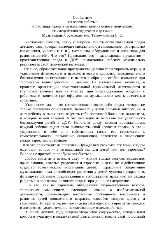 Сообщение из опыта работы на тему: "Говорящая среда в музыкальном зале на основе творческого взаимодействия педагогов с детьми"