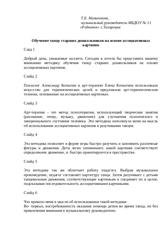 "Обучение танцу старших дошкольников на основе ассоциативных картинок"